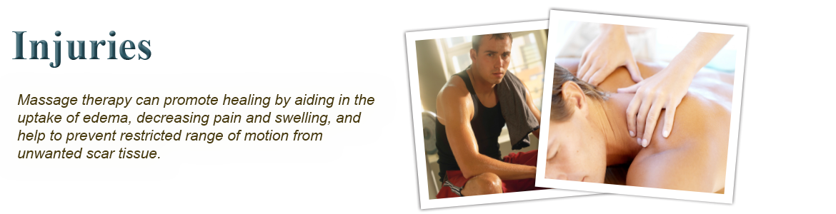 - Injuries- Massage Therapy can promote healing by aiding in the uptake of Edema, decreasing pain & swelling, and increasing range of motion.