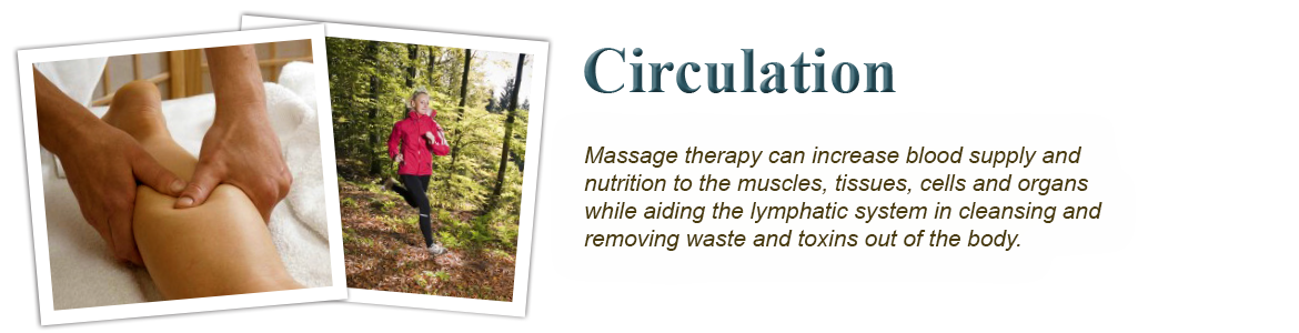 - Circulation- Massage Therapy can increase blood supply and nutrition to the muscles, tissues, cells and organs while aiding the lymphatic system in cleansing and removing waste and toxins out of the body.